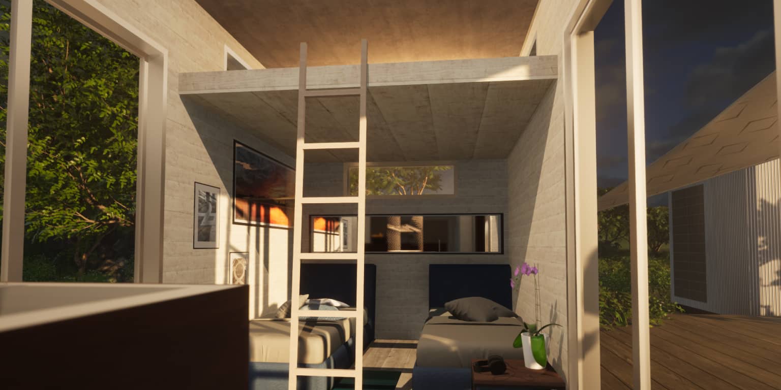 空間を出来る限り効率的に利用するために直方体に近い形状としており、インテリアにはロフトも備えております。